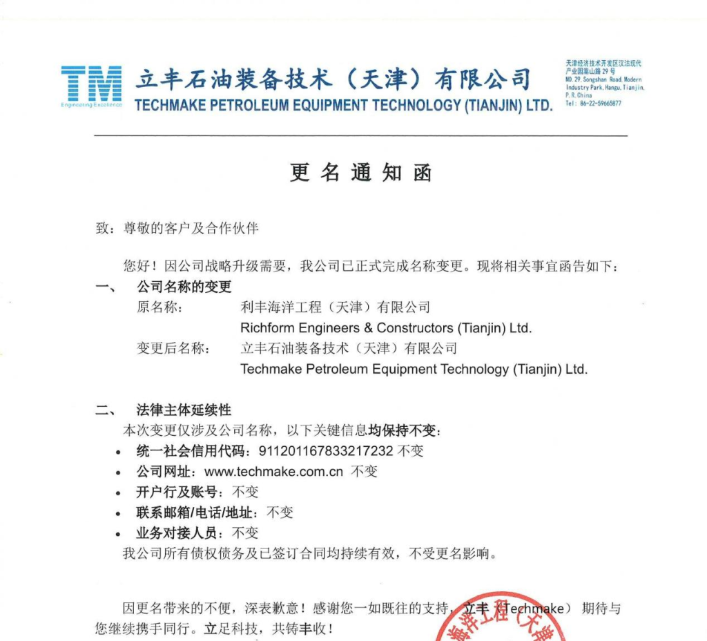 Новое название: «Лифэн Нефтяное оборудование и технологии (Тяньцзинь)»